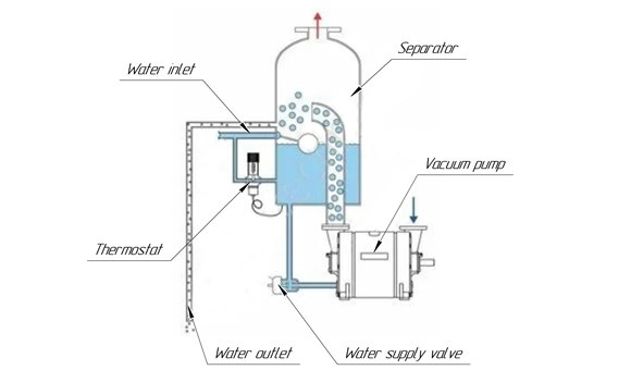 L’eau qui sort de la pompe peut être évacuée de la manière la plus simple directement vers le réseau d’égouts. Parfois, cette méthode est utilisée, par exemple, lorsque l’air aspiré contient des particules de suie qui se déposent dans l’eau. Comme le liquide devient contaminé, il est éliminé définitivement, car la réutilisation d’une telle eau réduirait rapidement la durée de vie de la pompe elle-même.